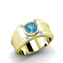 - Wide Band Retro Ring with 4 Diamonds and Topaz 18k Gold-Plated Sterling Silver Men's Jewelry