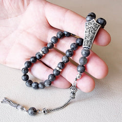 - 8mm NATURAL Stone Muslim Tasbih Gray Spectrolite 33 Round Beads 925 Silver Prayer Rosary(2)
