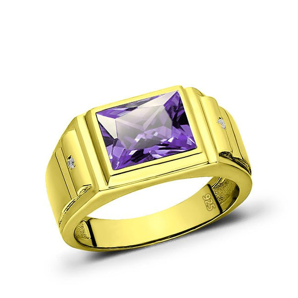 18K Gold Plated on 925 Solid Silver Mens Purple Amethyst Ring 2 Diamond Accents