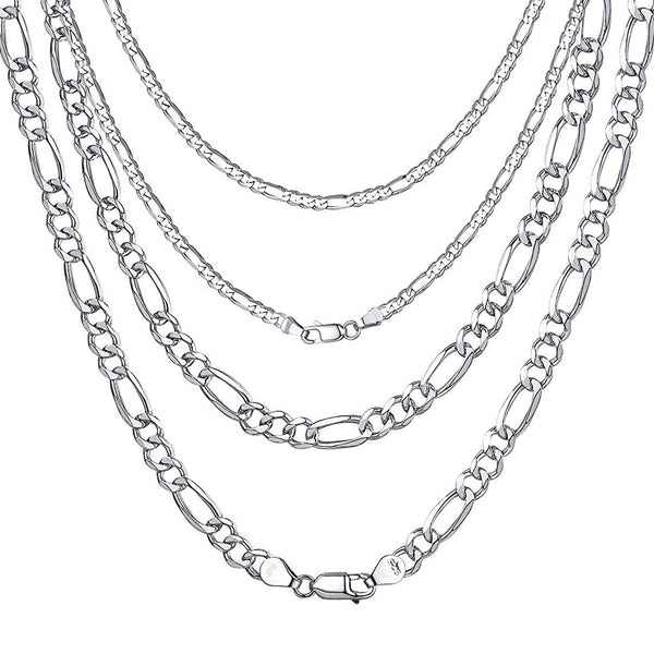 The chain features the classic Figaro link pattern, renowned for its unique alternating sequence of three small links followed by one larger one. With a width ranging from 0.12" to 0.23" (3-6 mm), this chain provides a perfect balance between delicate style and noticeable presence, catering to a range of personal tastes.