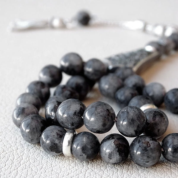 The round stone Tasbih Islamic gift showcases a blend of natural beauty and spiritual purpose. It features meticulously selected stones, including Tiger's Eye, Onyx, Labradorite, Howlite, and Spectrolite. These stones are chosen for their captivating appearance and significance. Paired with 925 Sterling Silver metal parts, stamped S925, the rosary offers a touch of elegance.