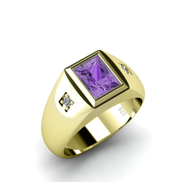 The striking rectangular faceted amethyst at the heart of the ring weighs a total of 2.40 carats. Its dimensions of 0.8 x 0.6 cm make it a noticeable yet tasteful feature. Set in a secure bezel setting, this gemstone's vibrant color is perfectly complemented by the gold-plated finish.