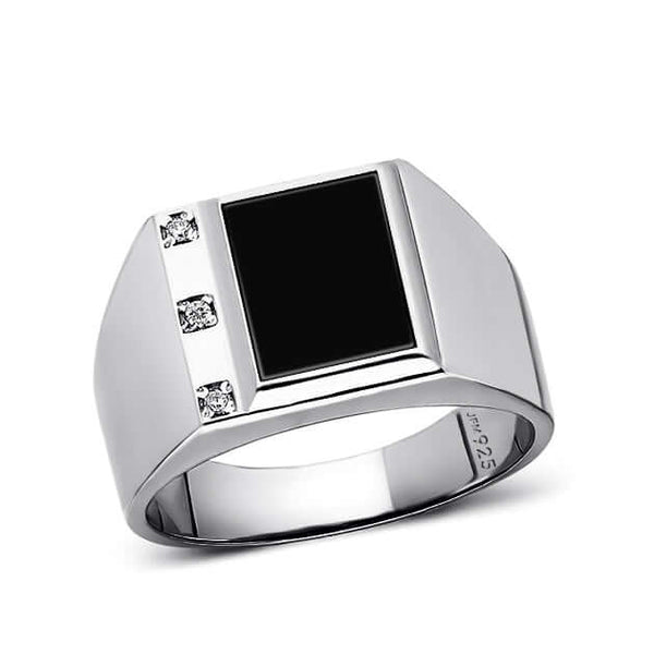 The Men's Solid Silver Ring beautifully blends timeless style with contemporary design. It features three natural diamonds, each crafted to perfection. The cut, color, and clarity of these gems are rated as Good, H, and VS1 respectively, ensuring their brilliance stands out. This elegant piece embodies sophistication for any occasion.
