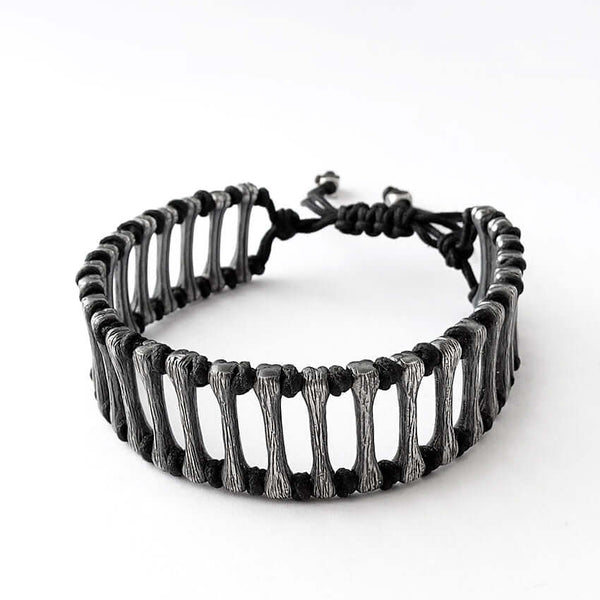 The Men's Wide Black Cord Bangle Bracelet combines elegance with rugged durability. It features a sleek black cord enhanced by striking 925 sterling silver bones, which weigh approximately 22 grams. The overall width of the bracelet is 0.67 inches or 1.7 centimeters, making it a bold accessory choice.