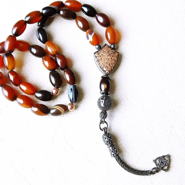 This Red Oval Stone Tasbih combines exceptional craftsmanship with premium materials. Featuring sterling silver metal parts with a 925 hallmark, this tasbih ensures both quality and authenticity. The natural agate stones used in the beads enhance its elegance.