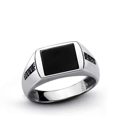 Complementing the main stone are pave-set onyx accent stones, adding depth and contrast. The strategic arrangement of these stones enhances the ring's overall design, making it a sophisticated choice for any occasion. Together, they create a balanced yet striking piece that suits diverse fashion styles.