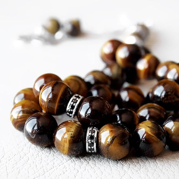 This 8mm round stone Islamic tasbih is crafted with meticulous attention to detail. The beads are made of natural Tiger's eye and Onyx, providing both strength and beauty. Each bead is approximately 0.3 inches in size, making it easy to handle during prayer or meditation. The tasbih features metal parts made from genuine 925 Sterling Silver, stamped with S925, adding a touch of elegance to the design.